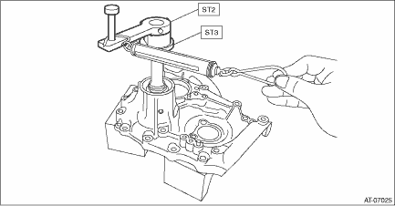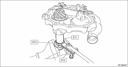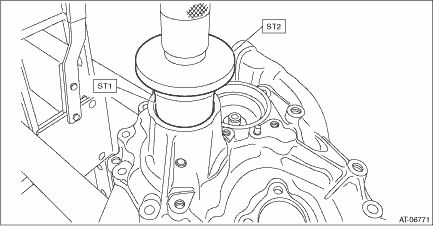 6. Using the ST1 and ST2, press-fit the inner race to the drive pinion shaft.