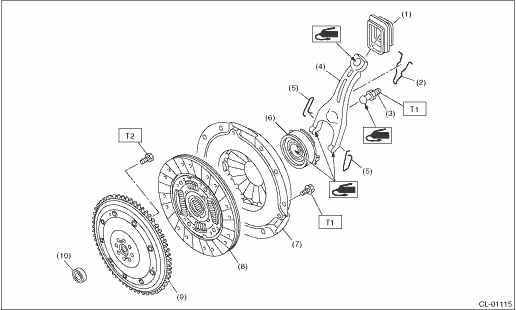 (2) | Lever spring | (7) | Clutch cover | T1: | 16 (1.6, 11.8) |