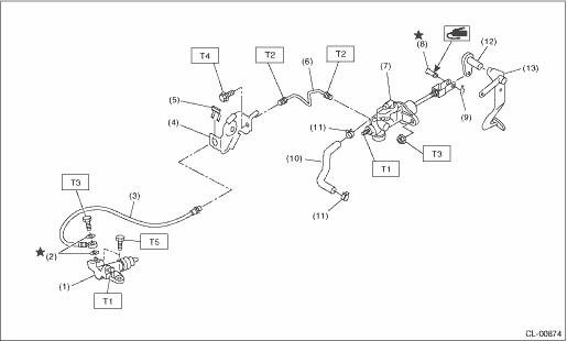 (4) | Clutch hose bracket | (11) | Clamp | T3: | 18 (1.8, 13.3) |