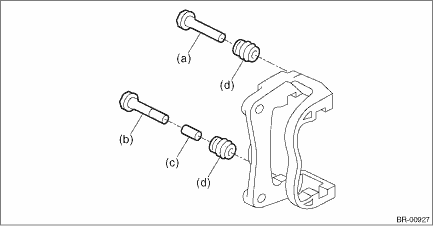 (a) | Guide pin - front brake (black) | (c) | Lock pin - sleeve | (d) | Pin boot |