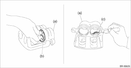 3. Remove the piston boot (b) and piston seal (c) from the caliper body cylinder (a).
