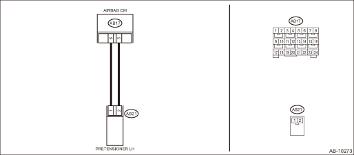 2) Disconnect the connector (AB21) from seat belt pretensioner (LH).
