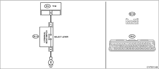 2) Measure the resistance between TCM connector and manual mode switch connector.