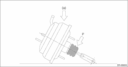 • If external force (a) is applied from above when the vacuum booster assembly is placed in this position, the resin portion as indicated by “P” may become damaged.