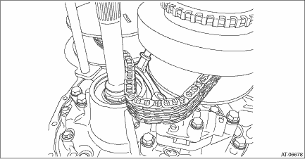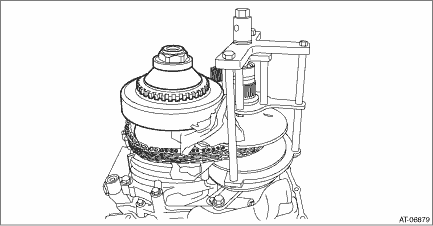 21. Remove the primary pulley from the reverse brake housing and intersect the V groove of secondary pulley and the V groove of primary pulley. Remove the variator chain from primary pulley, and remove the primary pulley.