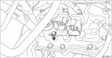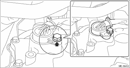 26. Remove the bolt which holds the transmission harness to the control valve body, and turn the transmission harness clockwise till the bolt hole can be seen as shown in the figure, and tighten the bolt to temporary lock the harness. (CVT model)
