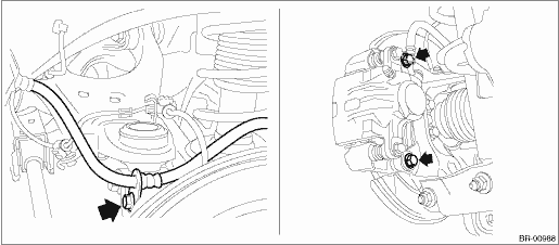 (1) Remove the bolts and then remove the brake hose bracket and caliper body assembly.