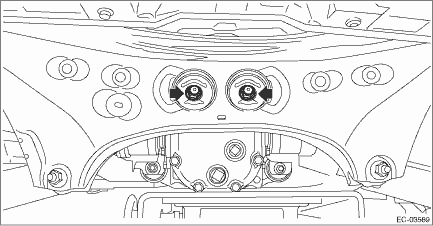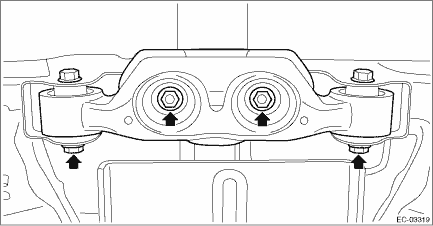 • When pulling out the stud bolt from the bushing portion of the rear sub frame assembly, adjust the angle and location of transmission jack and jack stand.