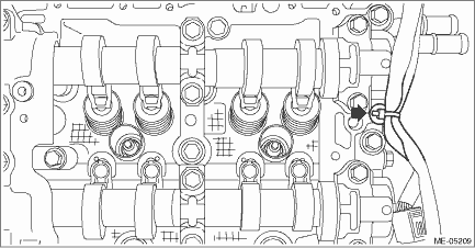 9. Insert the steel rods into ST, and set the engine so that the camshaft LH is facing up.