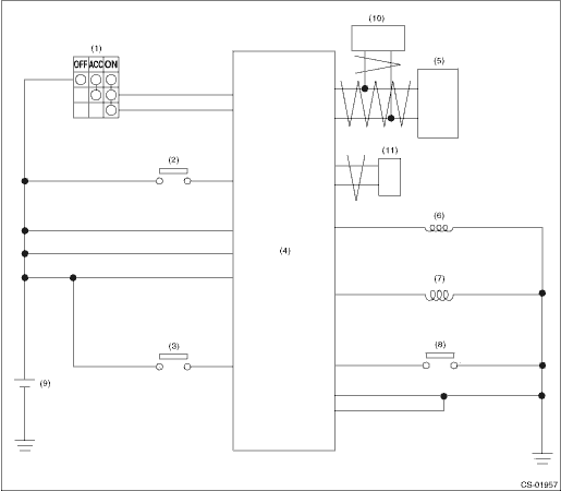 (2) | Stop light and brake switch | (6) | Key lock solenoid | (10) | ECM (delivery (test) mode signal) |